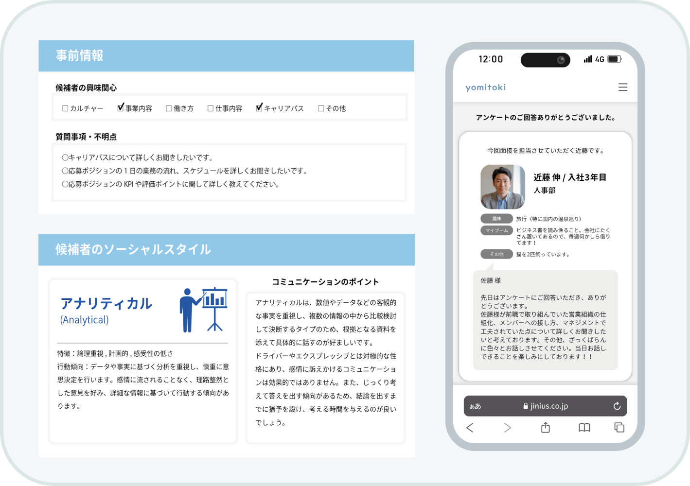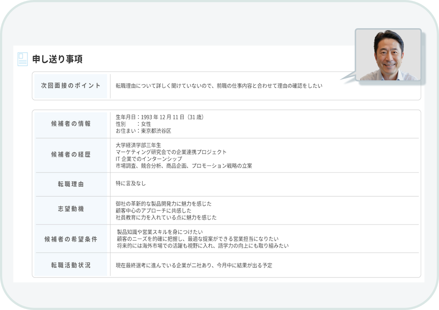面接中の候補者の発言から、候補者の経歴・転職理由・志望動機・希望条件・候補者からの質問などの基本項目を自動整理。次回面接官への申し送り書作成の手間を削減します。