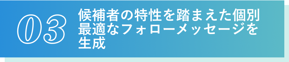 候補者の強みや特性など、面接での評価ポイントを踏まえたフォロー(アトラクト)メッセージをAI が自動で生成。事務的な連絡から脱却し、候補者一人ひとりにあわせたメッセージによる連絡が可能に。